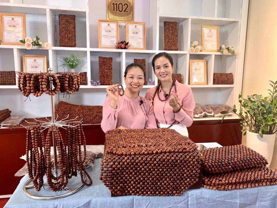 | Chị Đinh Thị Quỳnh Nga (bên trái) và nhóm sản phẩm từ hạt gỗ được UBND TP Hà Nội đánh giá, phân hạng 4 sao OCOP. |